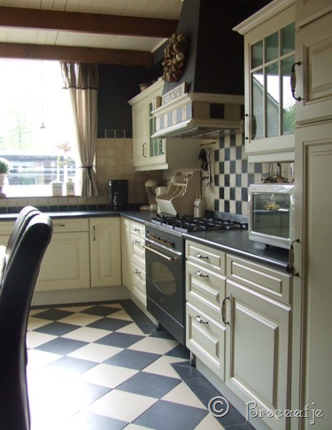 Dus twee soorten en kleur linnen,en daartussen zwart kant,wat ik mooi vind passen bij de keuken,zo komt alles weer bij elkaar.