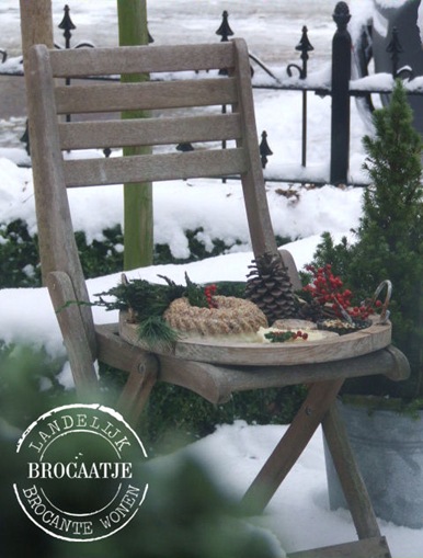 Grote tulband met vogelzaad,bakje met grote zaden,en een aardappel hartje,in de boom hangen pinda’s zo hebben een echt kerstmaal :-)