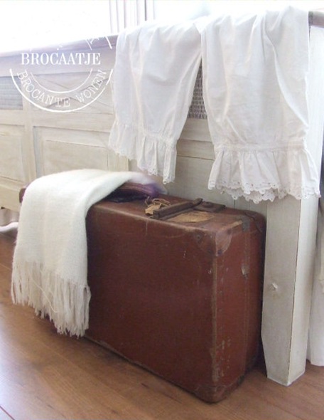 Over het bed heen hangt een hele oude lange onderbroek met kant.